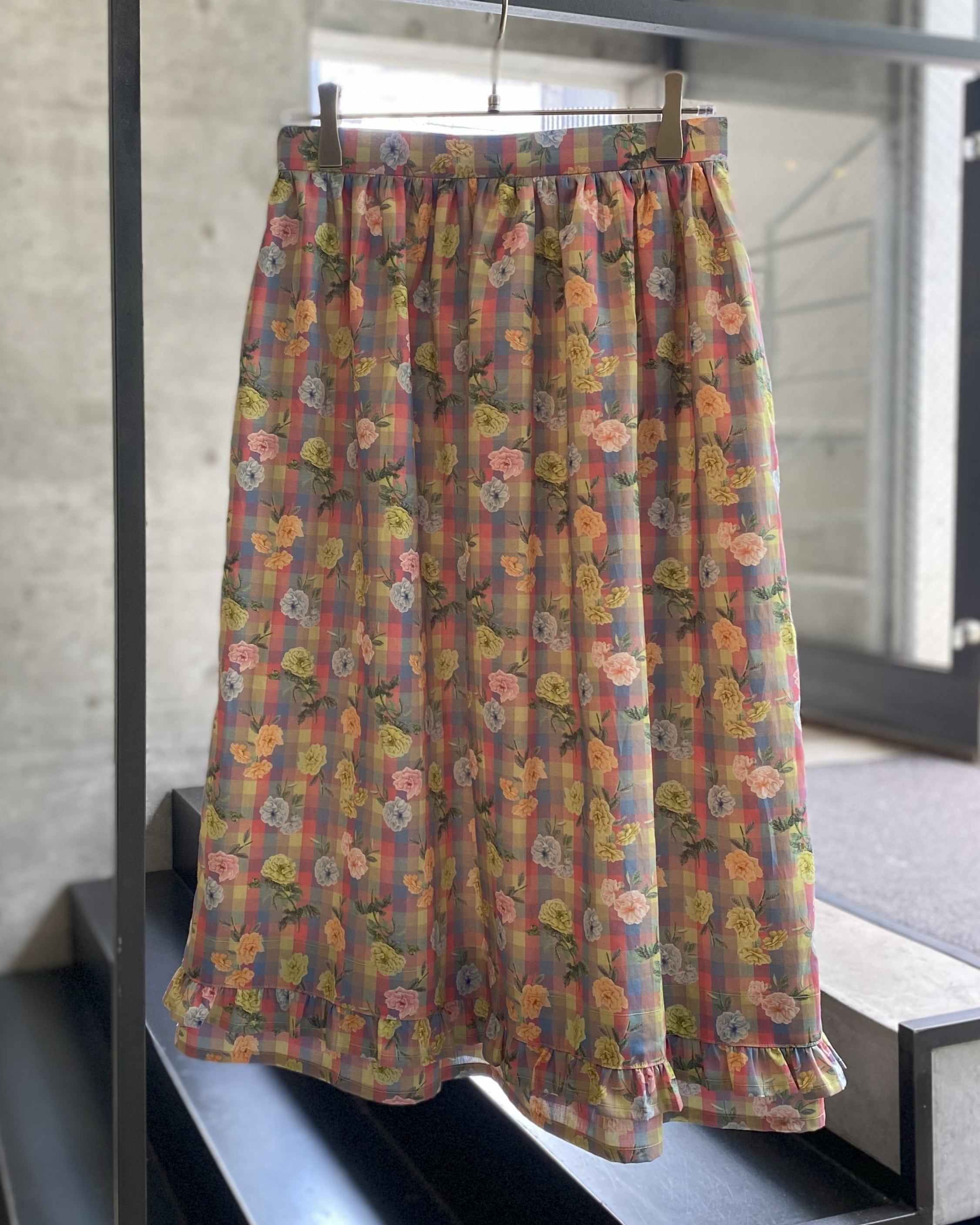 ビタミンカラーの花々と、どこか懐かしいマドラスチェックを掛け合わせた、Antique Carrieらしいレトロポップな一枚。
