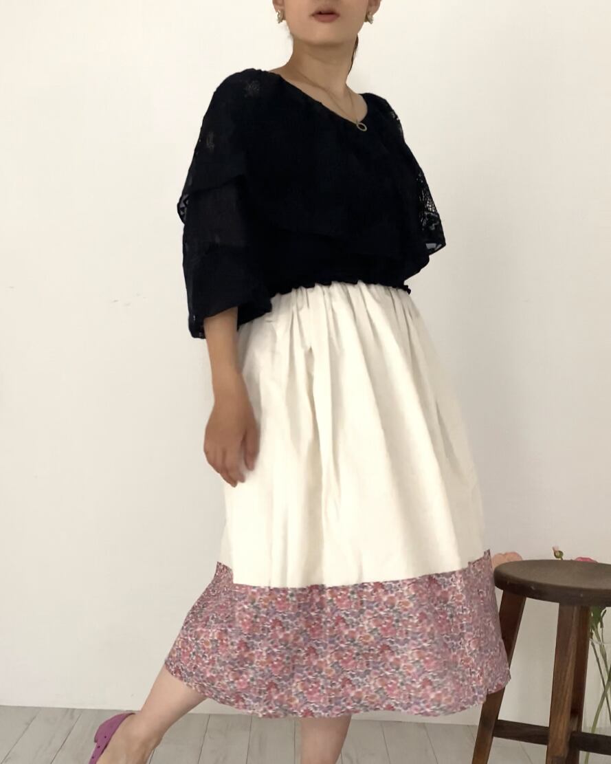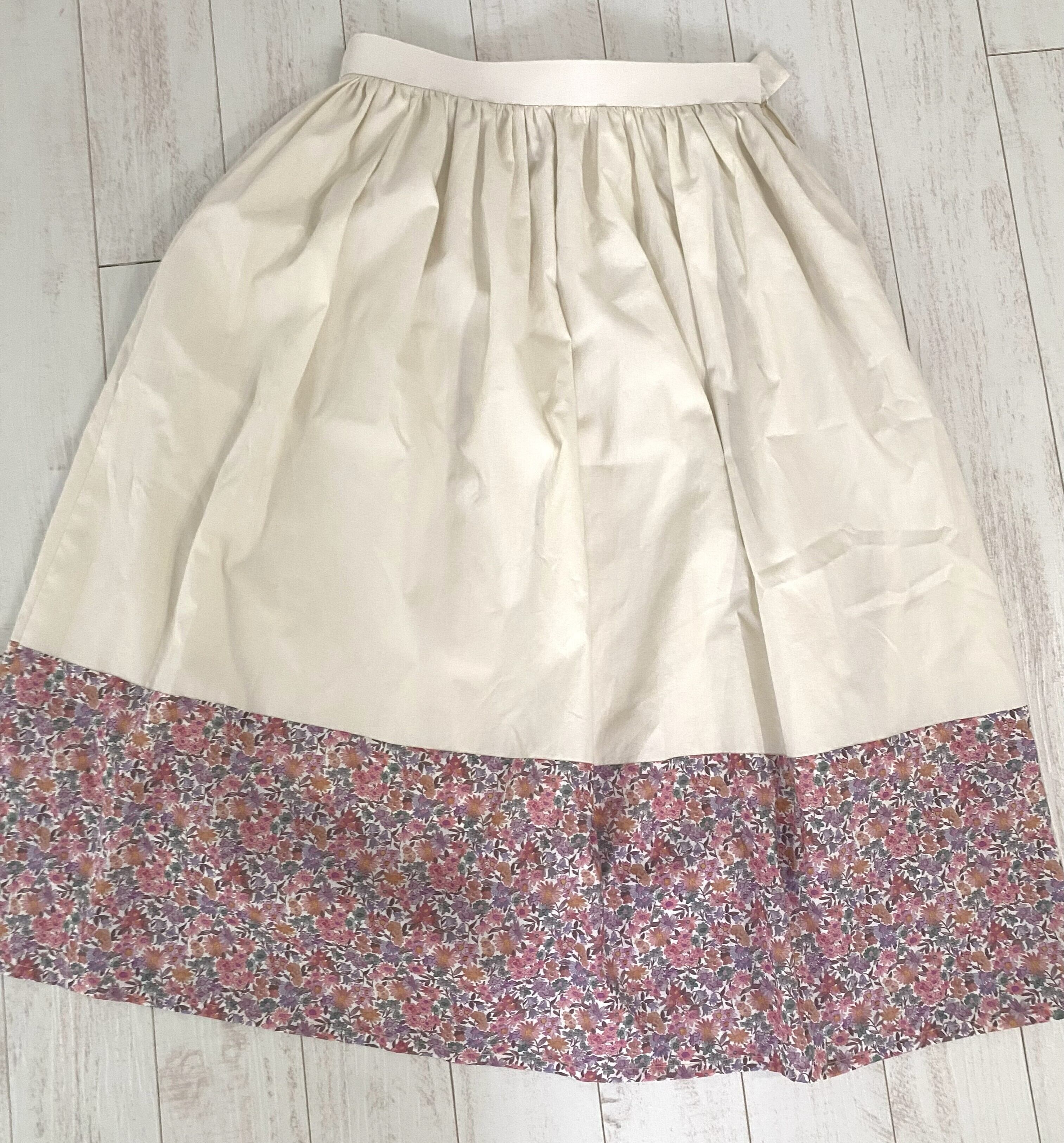 裾にあしらった季節限定のリバティ生地が、歩くたびふんわり揺れるミモレ丈スカート。