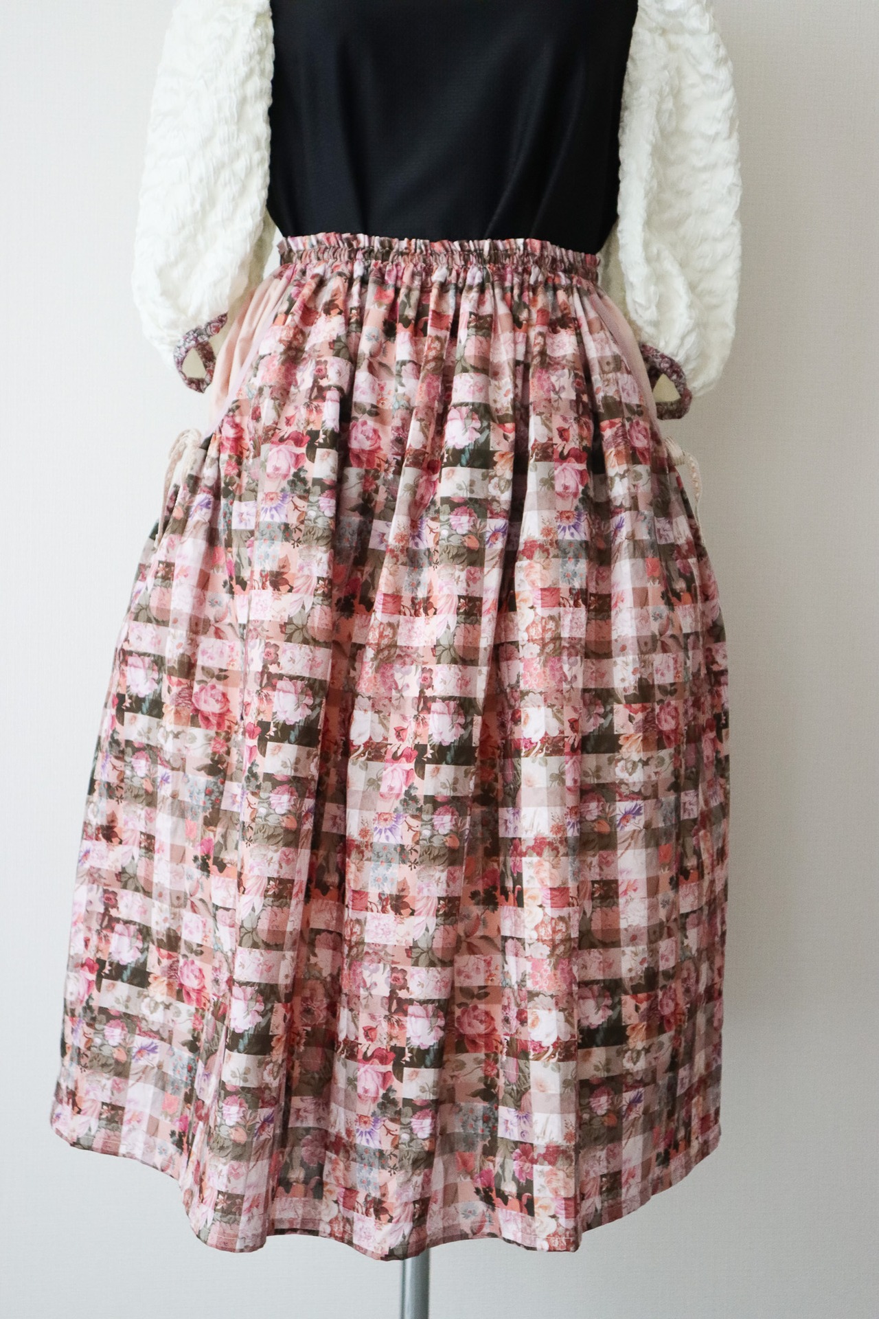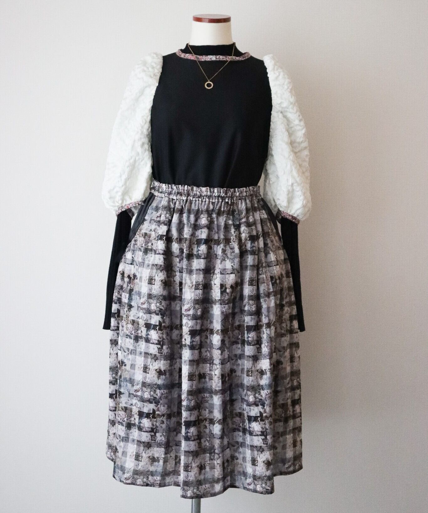 どちらも落ち着いた色味の中にローズガーデンが咲いて、静かな華やかさを添えてくれるスカートです。