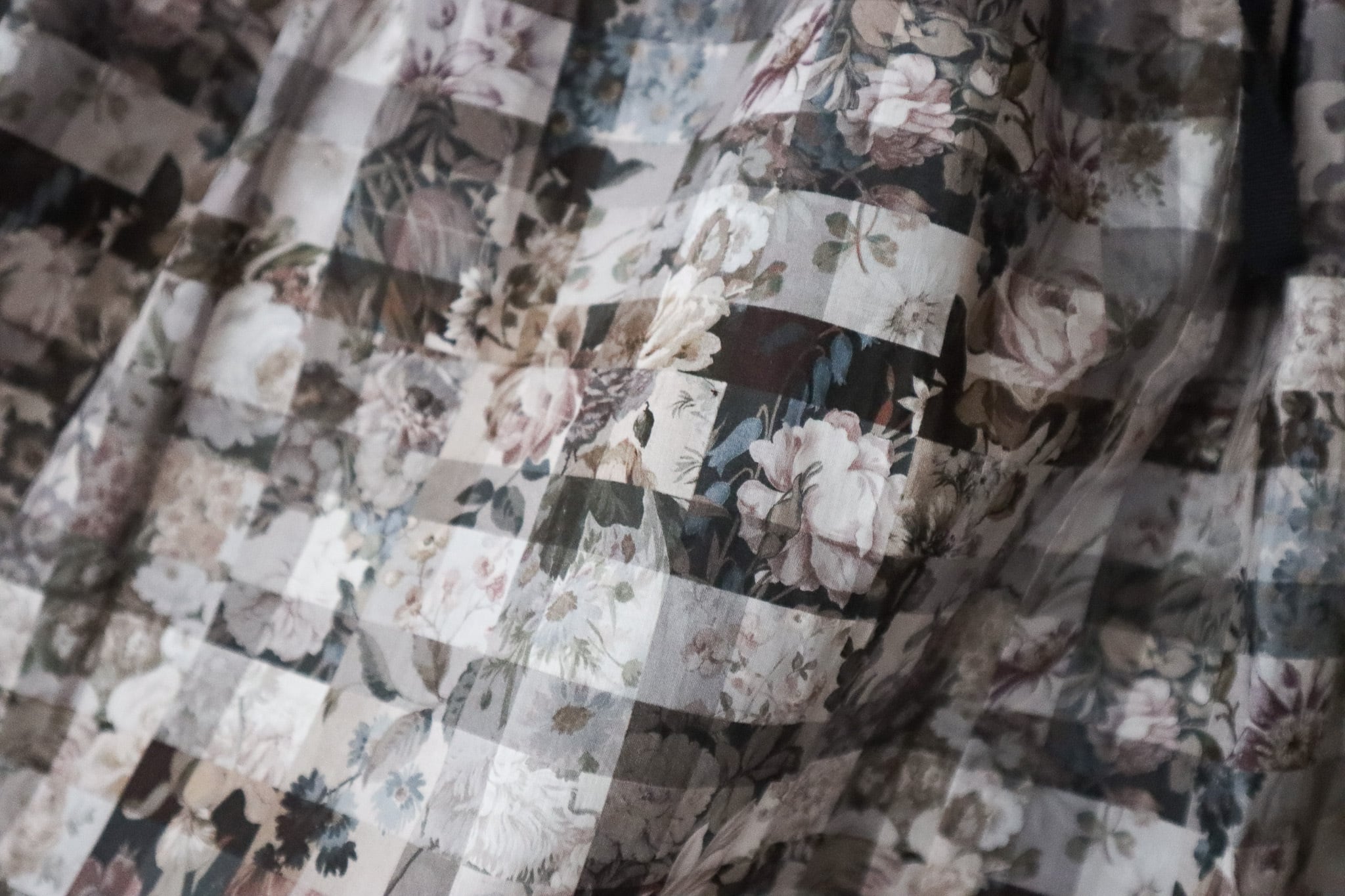細やかなギンガムに散りばめられた花々はまるで絵画のよう。