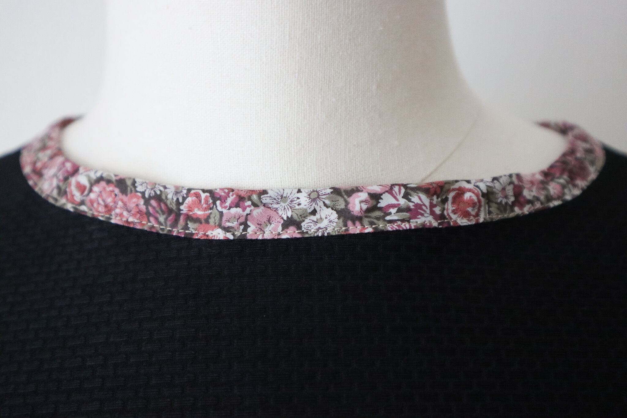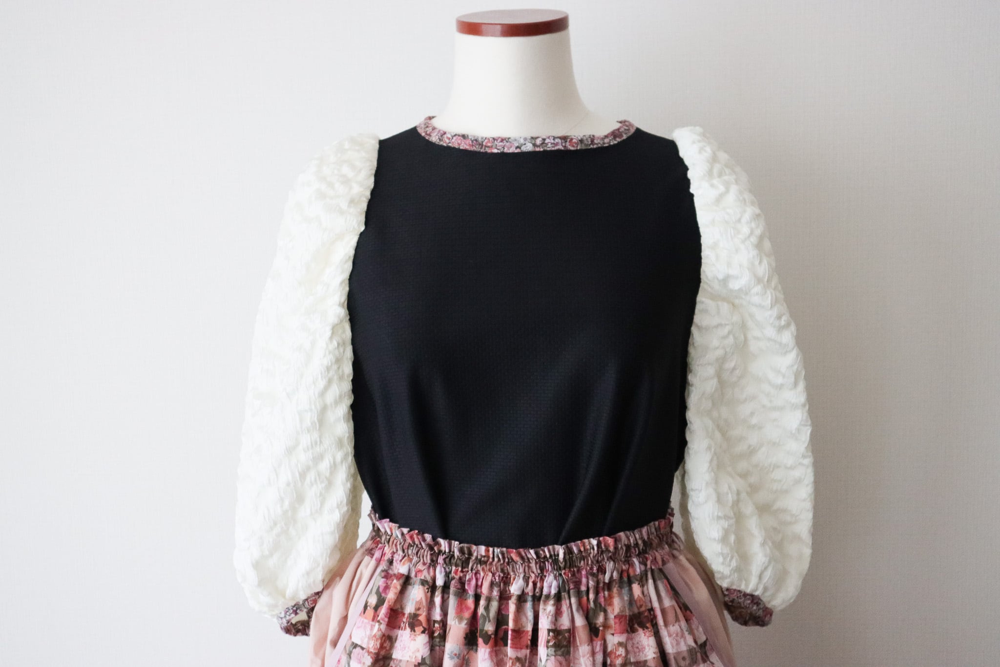 衿ぐりにリバティプリントをあしらった、6分袖パフスリーブのトップス。