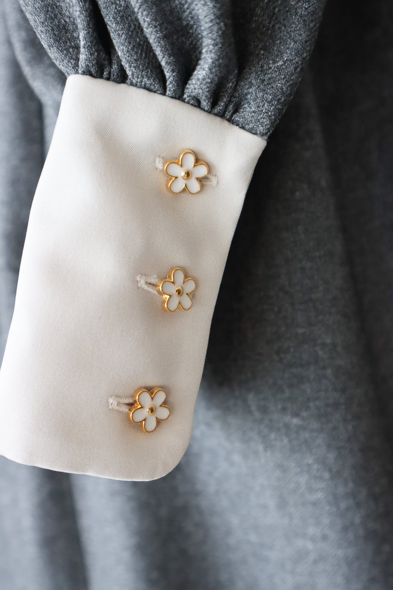 シンプルなグレーの上質ウールライクに、裾へ向かって花柄フリル(リバティ・マロリー)が咲くように広がるデザイン。